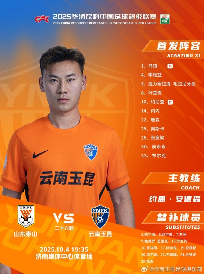 2025-10-05 00:29:22山东泰山vs云南玉昆 本场比赛首发阵容出炉
